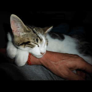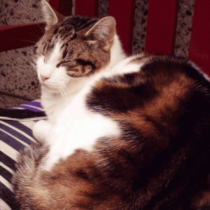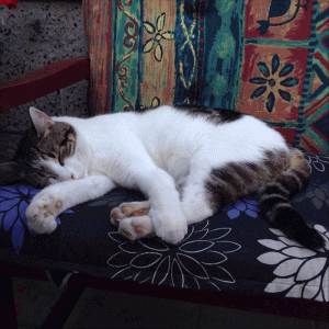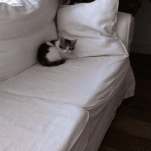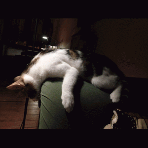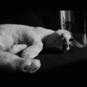 Een vaste slaapplek had je niet. De vensterbank, het yogakussentje, de tafel (languit), zelden op bed. En alleen op de bank als ik er lag.